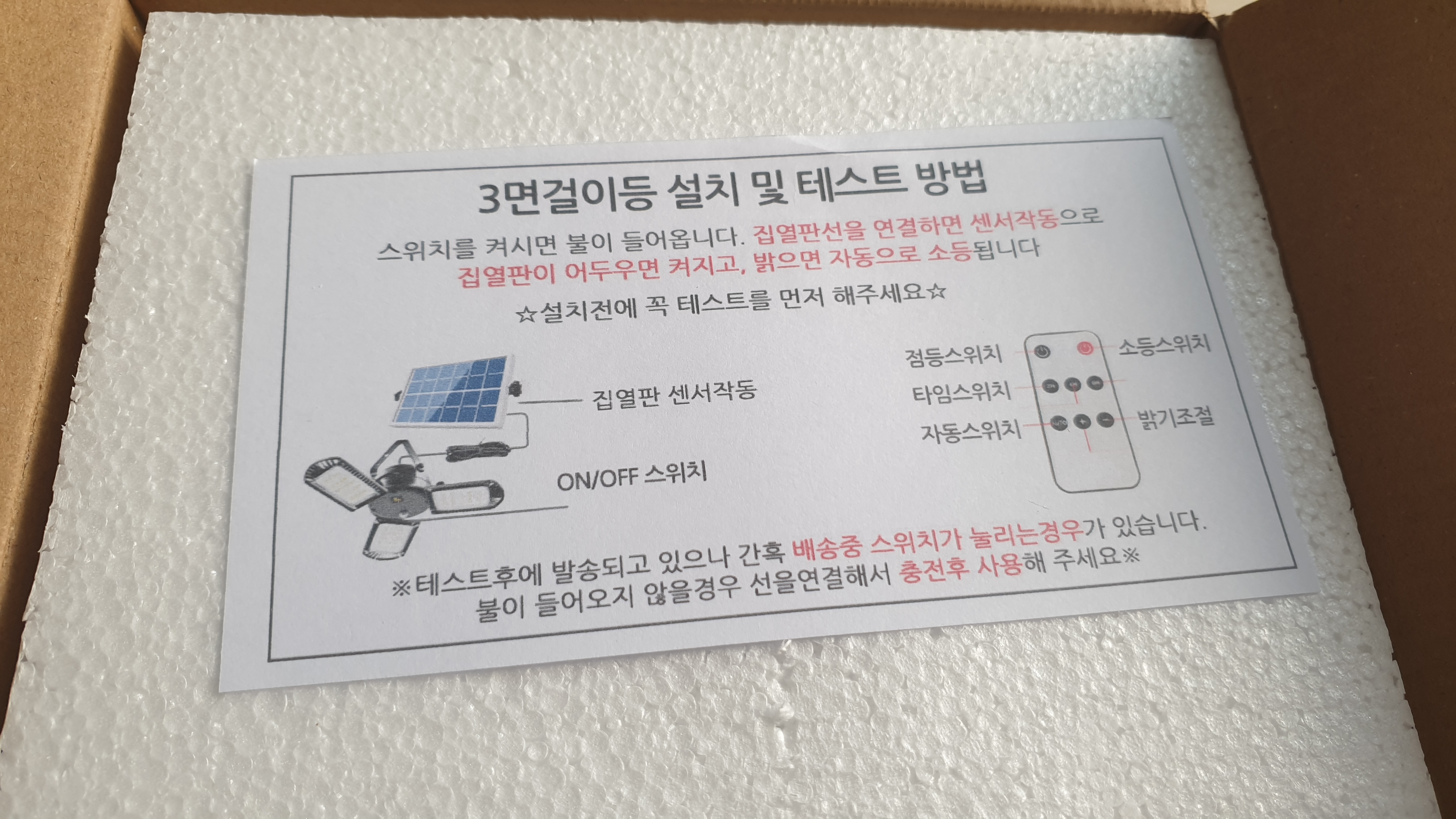 태양광 패널을 빛을 향해서 돌리면 불이 꺼지는데 실내등처럼 좀 약한 빛을 비추면