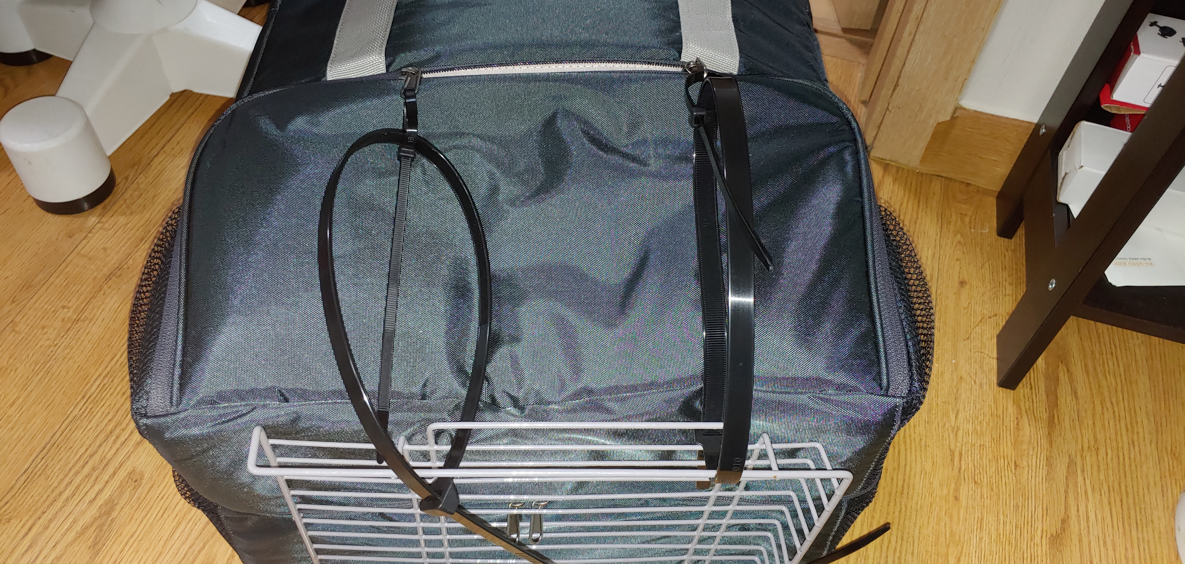 가방을 아래에 있는 곳에 고정하기위해서 케이블 타이로 고정을 하는데 주로 가방 자체에 있는 손잡이 자크를 이용합니다. 가방 자체에 자크 손잡이 외에는 지지해줄 곳이 없기 때문이지요