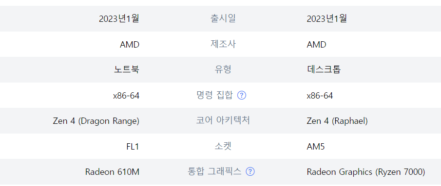 랩탑 7945hx는 드래곤 래인지 코어 아키텍쳐를 가졌고 데스크탑 7800x3d는 라파헬이군요