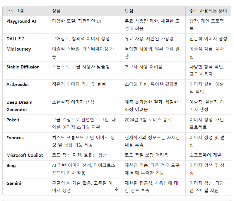 그리고 이와 더불어서 관련된 ai 프로그램들을 간략히 비교하는 도표를 통해서 정보를 좀더 취합해 보겠습니다.