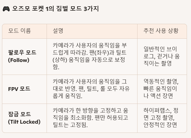 - 영상 해상도: 최대 4K 60fps 지원 → 스마트폰과 동급이지만, 3축 짐벌 덕분에 흔들림 없는 영상이 강점